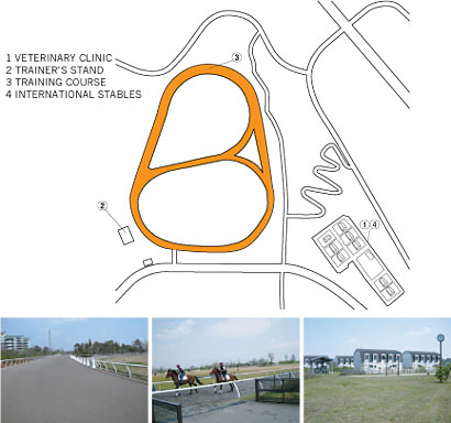 This Quarantine Center is located on the premises of JRA Horseracing School, which is about 50km/31.1 miles from the Narita International Airport. It is about 60 minutes by the horse van from the Airport. The facility accommodates a dirt training track of 1,400m (about 7 furlongs) in circumference and 17m wide.